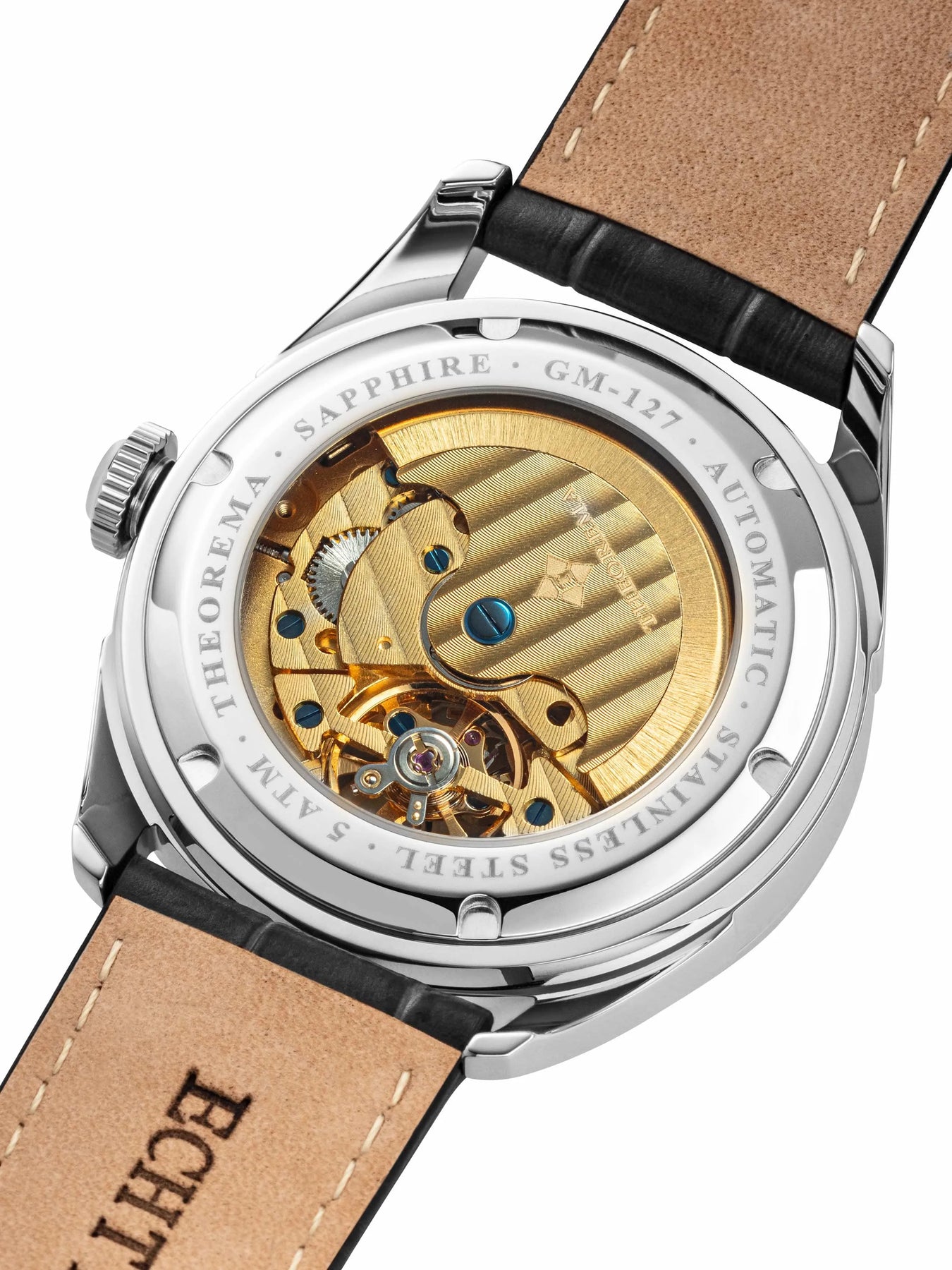 A testament to Theorema's distinctive approach, this watch incorporates a range of features. The dial's design is nothing short of impeccable, featuring an open-heart construction that reveals the inner workings, complemented by a multi-tone palette and dual-color hands that glide along elegant baton markers.